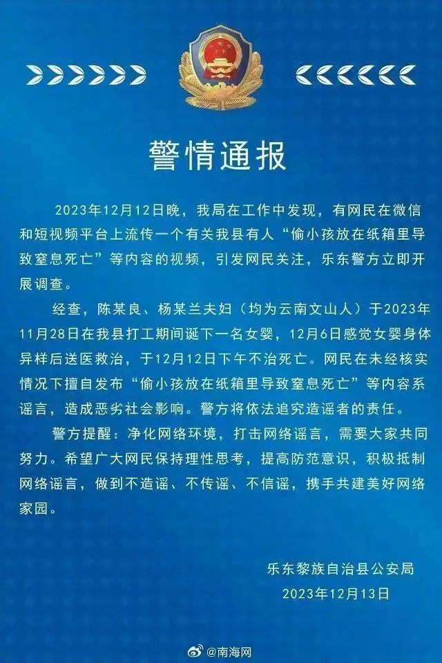 菠菜平台刷水2016欧洲杯冰岛战绩_13日,海南乐东县公安局发布警情通报称,陈某良、杨某兰良伴12月6日将一个月大的男儿送医救治,女婴于12月12日下昼因病圆寂。有网民在未经核实情况下发布谣喙,形成恶劣社会影响。警方将照章精良责难者的背负。(@海南网)