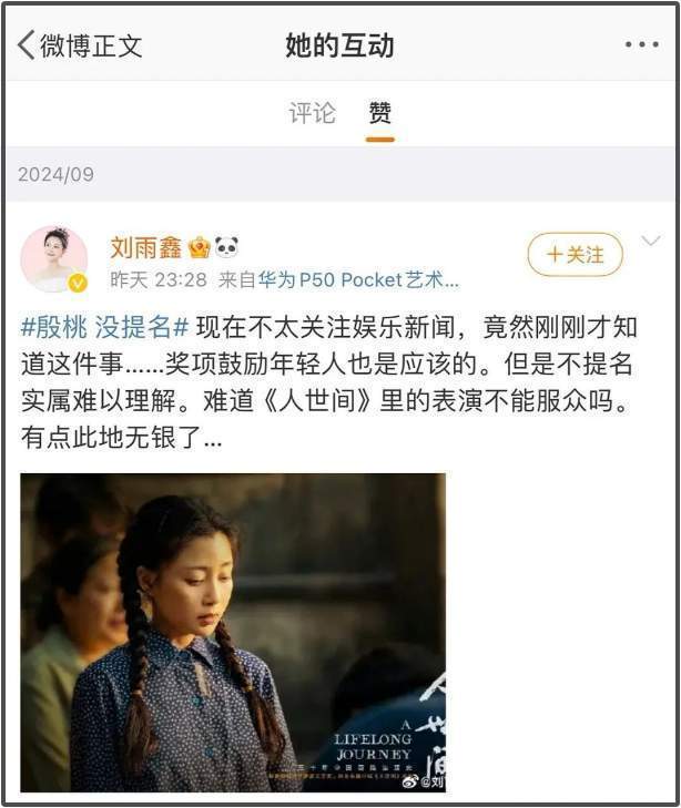 淌若说刘雨鑫的发文仅仅个东谈主的吐槽,关联词殷桃凌晨的点赞和探究则把没提名这件事带到了另一个走朝上去。